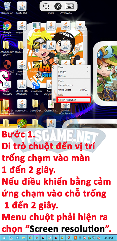 Bước 1. Di trỏ chuột đến chỗ trống trên màn hình và dí cho đến khi hiện ra menu giống trong hình (nếu điều khiển bằng cảm ứng không dùng con trỏ chuột thì chỉ cần dí vào chỗ trống trên màn hình là được). => Sau đó chọn “Screen resolution“.