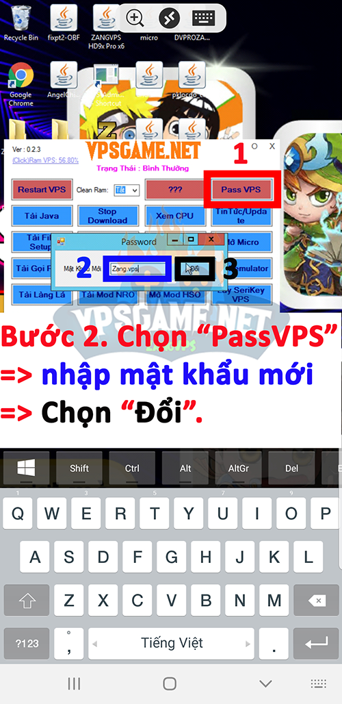 Bước 2. Chọn “Pass VPS”.=> nhập mật khẩu mới. => sau đó chọn “Đổi“.