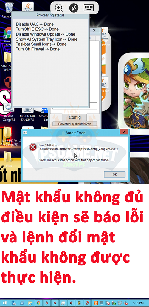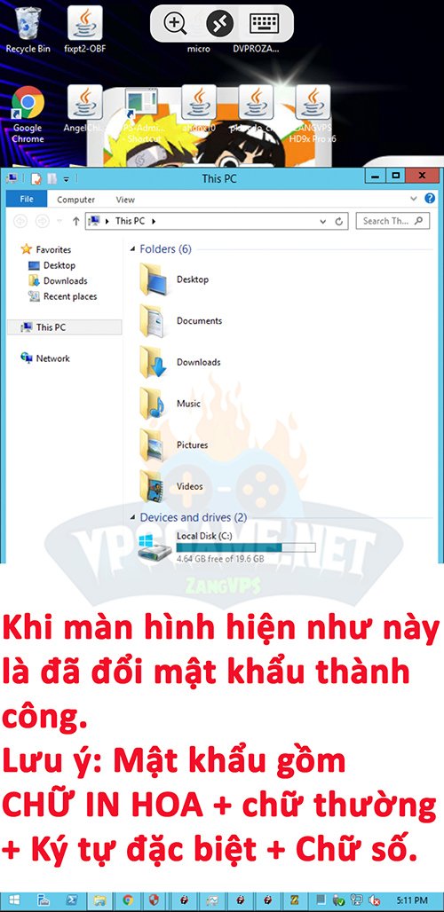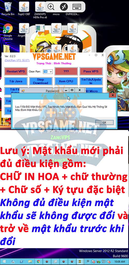 **Lưu ý: Nếu sử dụng cách này để đổi mật khẩu VPS sẽ dễ dẫn đến sai sót hơn nên khuyên các bạn sử dụng cách 1. Bởi vì khi mật khẩu được đổi hay chưa được đổi thành công hệ thống cũng chỉ hiện cái lưu ý giống trong ảnh bên dưới mà thôi dễ gây ra nhầm lẫn. Với cách này mật khẩu vẫn phải đáp ứng đủ các yêu cầu CHỮ IN HOA + chữ thường + chữ số + ký tự đặc biệt .