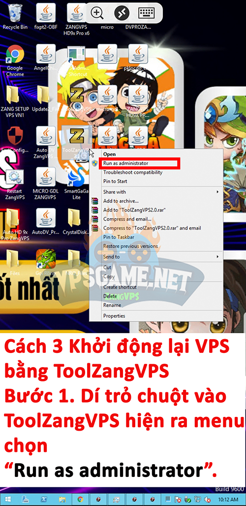 Bước 1. Đưa trỏ chuột đến ToolZangVPS sau đó di vào màn hình đến khi xuất hiện menu như hình bên dưới. => Sau đó chọn “Run as administrator”.
