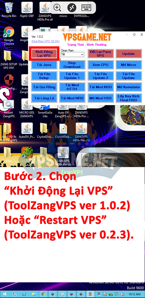 Bước 2. Chọn “Restart VPS” đối với tool ver 0.2.3 nếu là tool ver 1.0.2 chọn “Khởi Động Lại VPS“.
