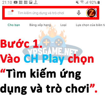 Bước 1. Vào CH Play => Chọn “Tìm kiếm ứng dụng và trò chơi“.