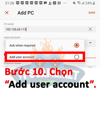 Bước 10. Bỏ tích “Ask when required” chọn “Add user account“.