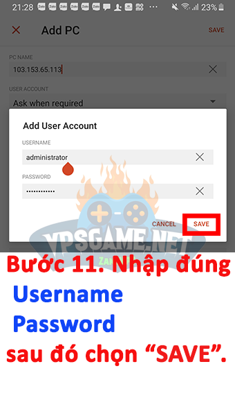 Bước 11. Nhập đúng “USERNAME” và “PASSWORD” (nên sử dụng copy- paste để tránh bị sai). => nhập xong chọn “Save“.