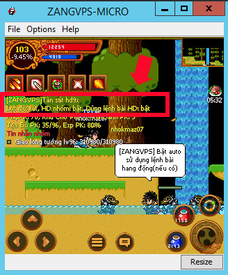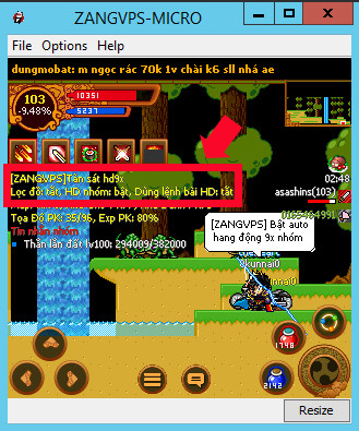 - Chat ” hd ” để bật auto đi hang động 9x 2 lần, kết thúc lệnh chat sẽ có thông báo “[ZANGVPS] Bật auto hang động 9x” bảng info sẽ hiện như trong hình bên dưới.