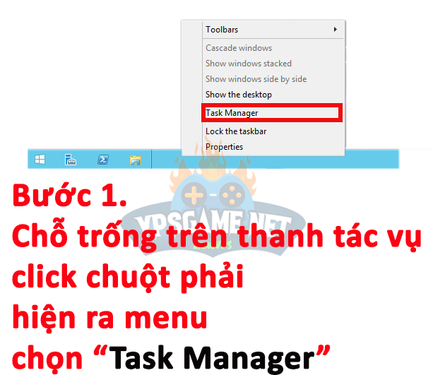 Bước 1. Mở “Task Manager“. Click chuột phải vào chỗ trống trên thanh công cụ sẽ hiện ra menu => Chọn “Task Manager“.