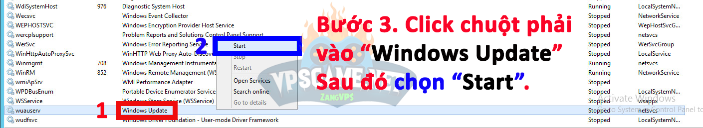 Bước 3. Lăn chuột xuống dưới tìm và click chuột phải vào “Windows Update” => chọn “Start“.