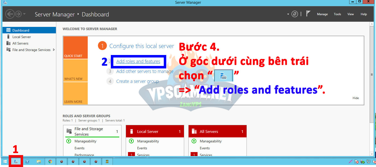 Bước 4. Trên thanh taskbar chọn mở “Server Manager” => chọn “Add roles and features“.