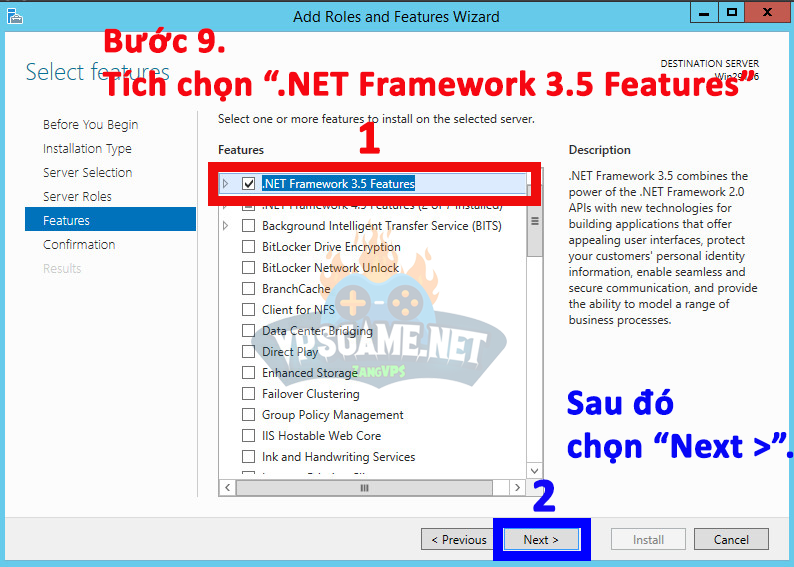 Bước 9. Tích chọn vào ô “.NET Framework 3.5 Features” => chọn “Next >“.