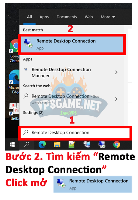 Bước 2. Tìm kiếm theo từ khóa ” Remote Desktop Connection” như trong ảnh