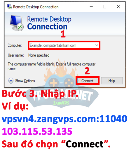 Ví dụ: IP có dạng vpsvn4.zangvps.com:11040 hoặc 103.115.53.135 (khi nhập vào sẽ sử dụng thông tin được cấp cho từng khách hàng).