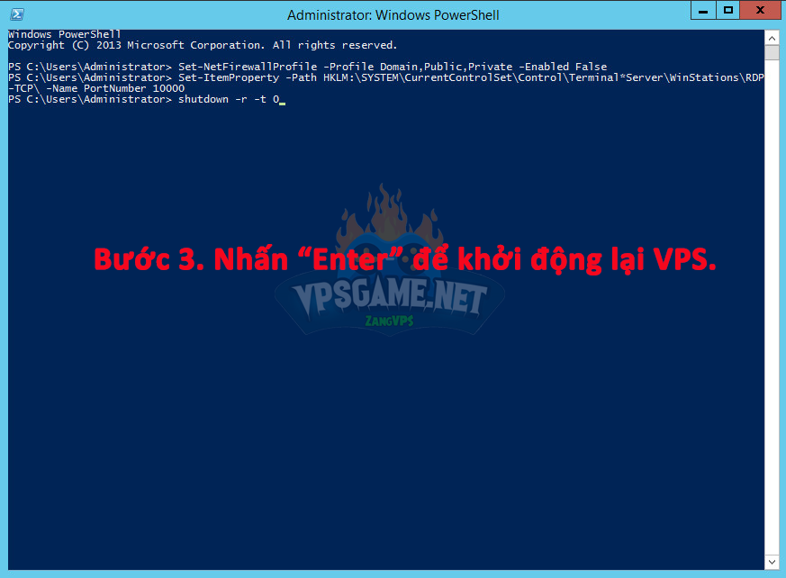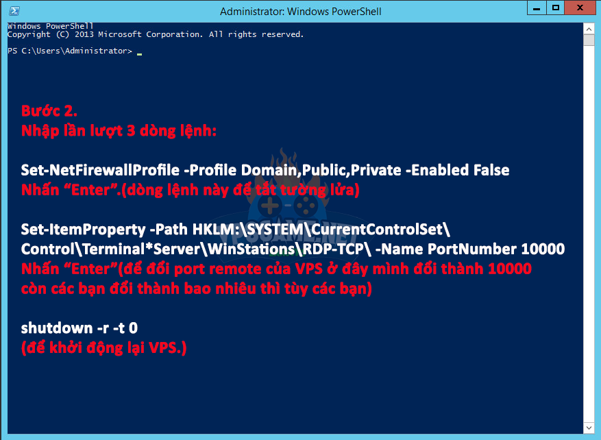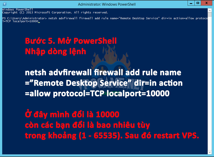 **Lưu ý: port ở câu lệnh phải giống với PortNumber đổi ở bước 4 (bước 4 mình đổi là 10000 thì bước 5 ở phần cuối của câu lệnh cũng phải là 10000) như vậy khi remote VPS mới không bị tường lửa chặn.