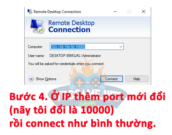 Bước 4. Mở “Remote Desktop Connection” => Nhập IP của VPS và thêm port mới vào sau IP.