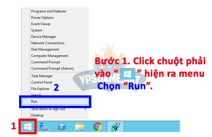 Bước 1. Trên taskbar của VPS click chuột phải vào biểu tượng windows (còn gọi là Start) hiện ra menu => chọn “Run“.
