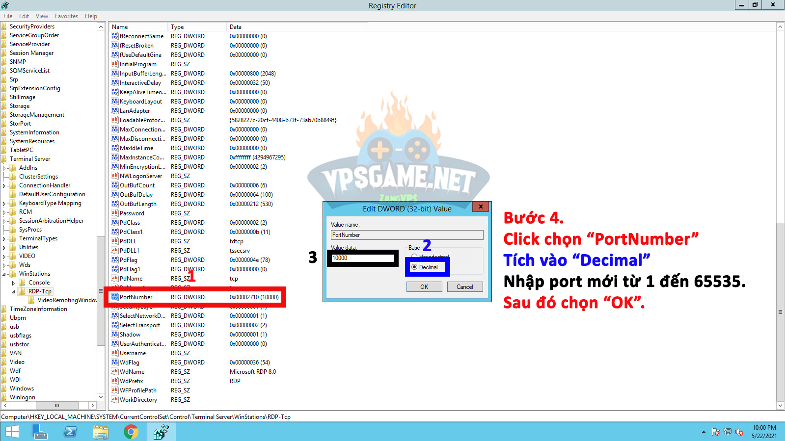 Bước 4. Click chọn “PortNumber” => Tích vào mục “Decimal” => Nhập port mong muốn trong khoảng từ 1 đến 65535 => Chọn “OK“.