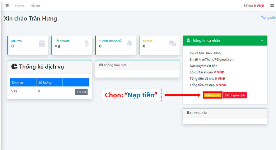 Sau khi tạo tài khoản và đăng nhập thành công vào Portal VPS Game. Bài viết này sẽ hướng dẫn các bạn nạp tiền vào tài khoản.