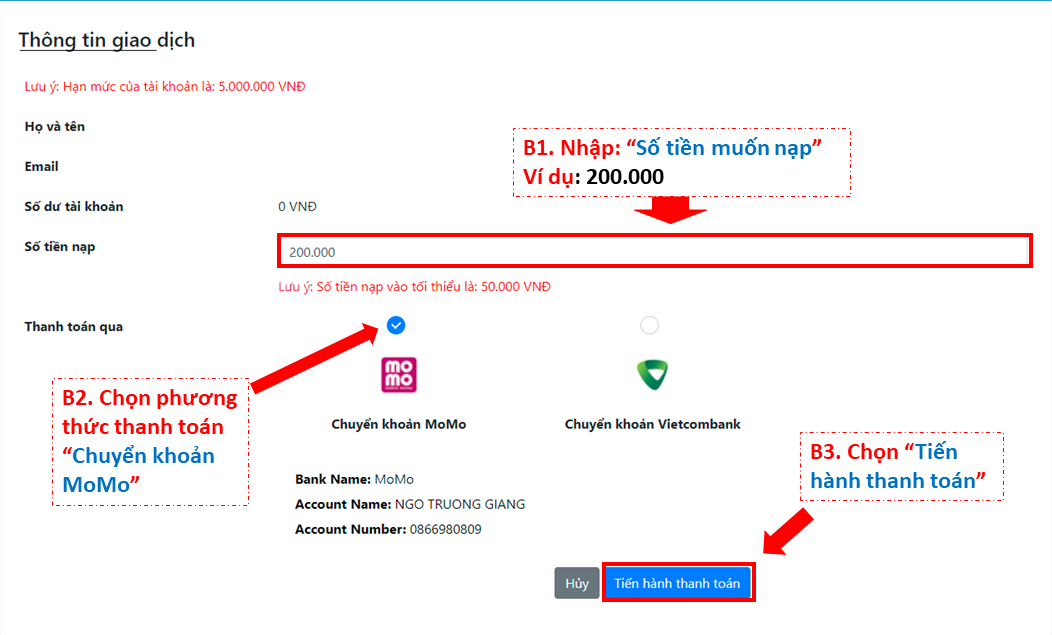 Bước 1. Nhập số tiền muốn nạp (tối thiểu là 50.000 VNĐ) => Chọn phương thức thanh toán qua MoMo. => Chọn “Tiến hành thanh toán” để gửi yêu cầu nạp tiền của bạn đến admin.
