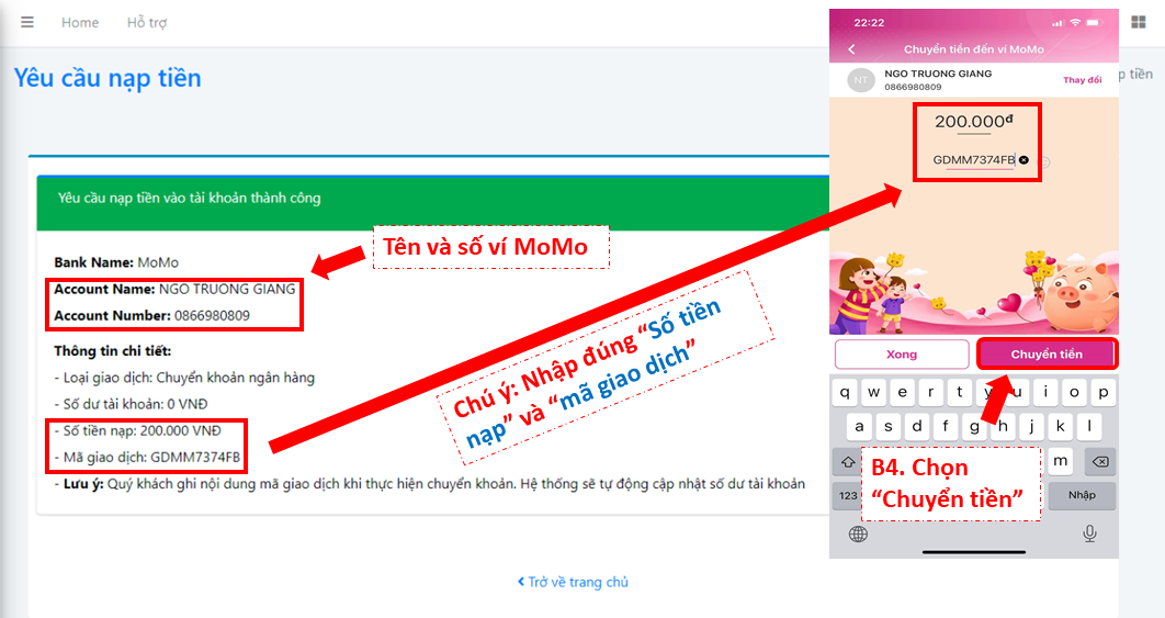 **Lưu ý: Nhập đúng thông tin ví MoMo của admin, số tiền và mã giao dịch tương tự hình dưới.