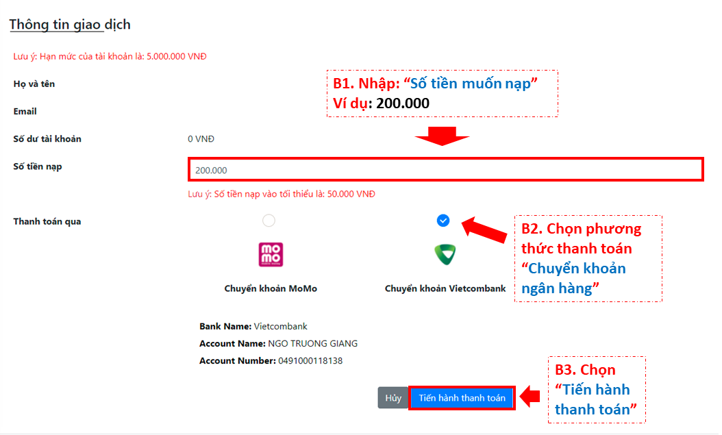 Bước 1. Nhập số tiền muốn nạp (tối thiểu là 50.000VNĐ) => Chọn phương thức thanh toán. => Chọn “Tiến hành thanh toán.”