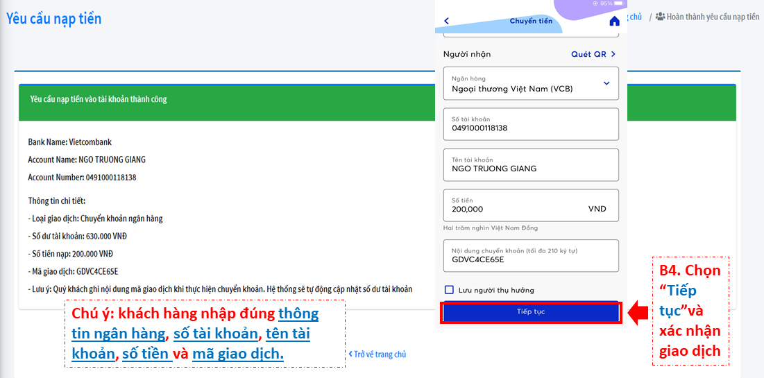 **Lưu ý: Nhập đúng thông tin tài khoản của admin, số tiền và mã giao dịch đã được cấp giống với hình dưới.