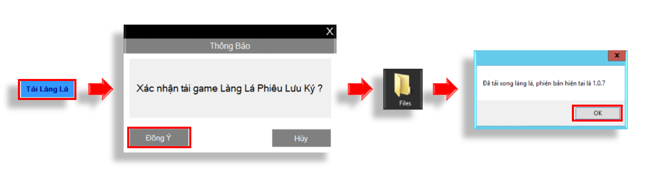 Bước 2. Click chọn “Tải Làng Lá” => “Đồng ý” => Khi đó file LangLaFull.exe sẽ được tải về thư mục “Files” => Tải xong sẽ có thông báo như hình dưới.